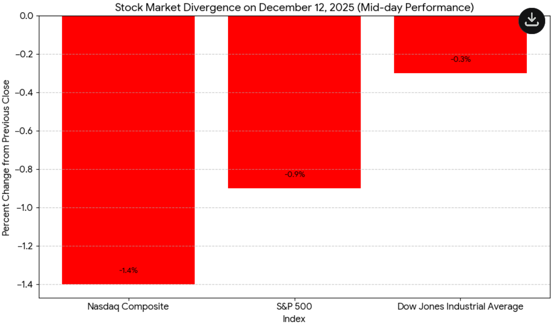 The central news affecting stock markets on December 12, 2025, was a widespread cooling of investor enthusiasm for the high-flying AI sector, which triggered a significant sector rotation across Wall Street. This shift was primarily driven by disappointing guidance from key AI bellwethers, notably Broadcom (AVGO). Despite reporting strong revenue, Broadcom shares plunged by over 10% midday after management warned that future gross margins could be pressured due to a higher mix of AI-related business, suggesting the massive investment in AI infrastructure may not be immediately translating to durable profits. This followed a similar sharp drop for Oracle (ORCL) the day prior, reinforcing a narrative that AI valuation and profitability concerns were hitting the most crowded trade.
