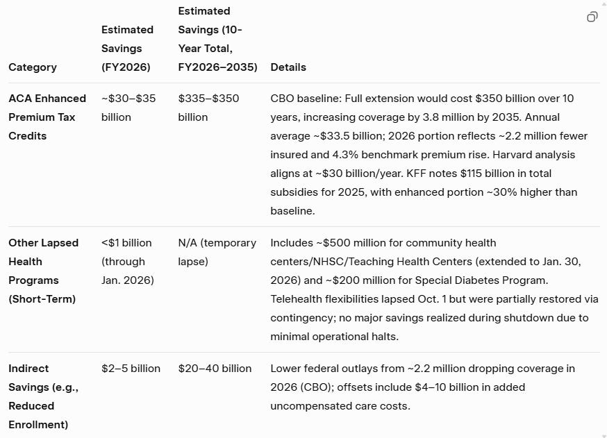 The cost of the shutdown could have been worse. The Congressional Budget Office (CBO) and other nonpartisan analyses have estimated the federal budget savings of not extending the enhanced ACA subsidies. Savings accrue from reduced federal spending on premium tax credits, though offset by indirect costs like higher uncompensated care (e.g., emergency room visits by the newly uninsured) and potential premium hikes for all plans due to a sicker risk pool. For FY2026 specifically (the immediate post-shutdown year), savings are prorated from multi-year projections.