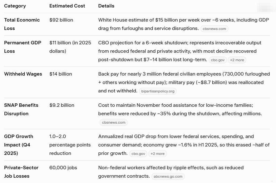 The shutdown’s total economic impact is estimated in the tens of billions of dollars, primarily from lost productivity, reduced federal spending, and decreased private-sector demand. Most losses were temporary (e.g., deferred wages and services), but some were permanent due to irrecoverable output. Here’s a breakdown based on analyses from the Congressional Budget Office (CBO), the White House, and other sources: